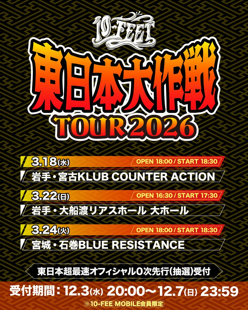 10-FEETによるスペシャルツアー「10-FEET 東日本大作戦 TOUR 2026」の開催が決定した。このツアーは、東日本大震災から15年という節目にあわせた“東日本大作戦番外編”として実施される。