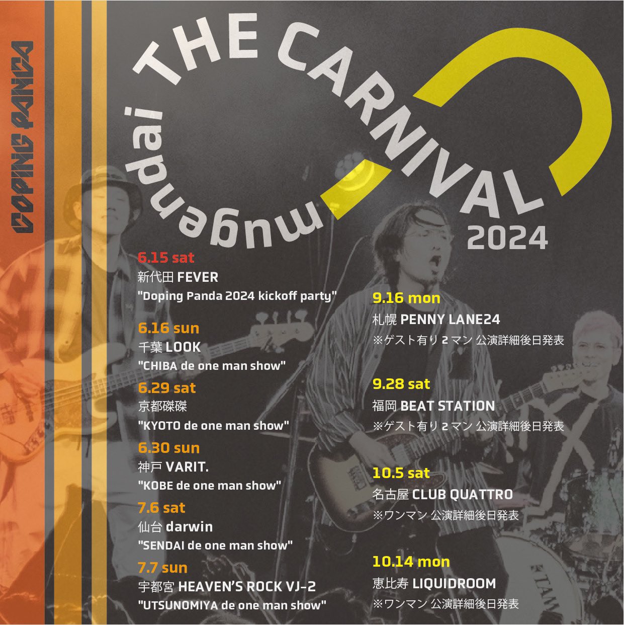 また、DOPING PANDAは、昨年好評を博したコンセプトツアー『mugendai THE CARNIVAL』を今年も開催することも同時に発表。6月16日(日)千葉LOOKを皮切りに、10月14日(月・祝)東京・恵比寿LIQUIDROOMまで、4カ月をかけて全国ライブハウスを回る全9公演のツアー。ワンマンにて開催される公演と、ツーマンにて開催される公演が混在しており、各公演にサブタイトルが用意されている(9月以降の公演の詳細は後日発表)。