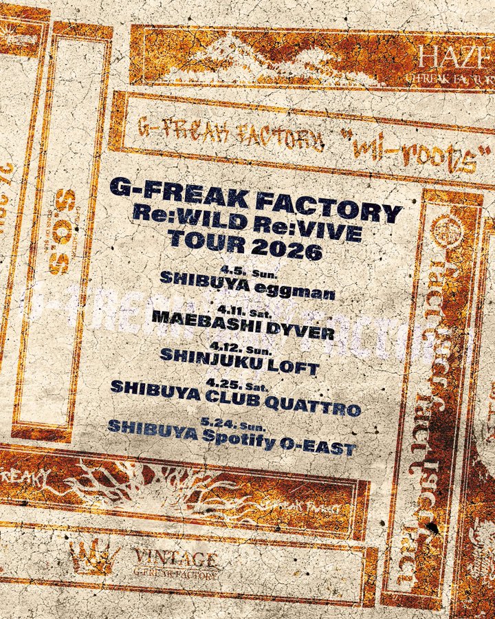 G-FREAK FACTORY が、過去8枚のアルバムをフィーチャーしたツアー「Re:WILD Re:VIVE TOUR 2026」を4月から開催することを発表しました。現在、5公演の開催が発表されており、FREAKY先行受付が開始となっている (〜1/18(日) 23:59)。