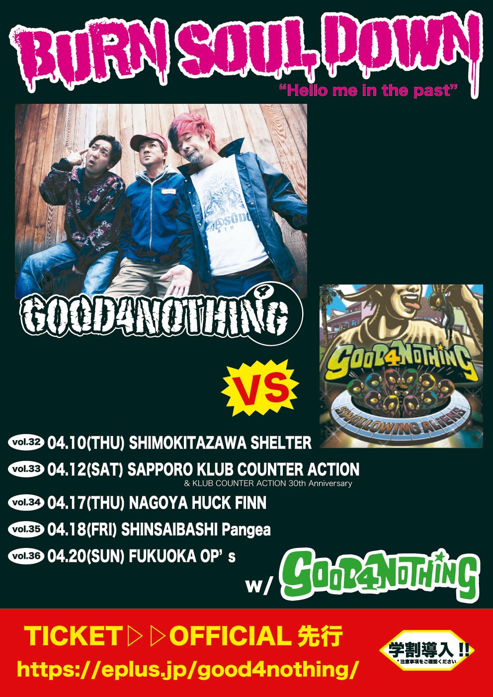GOOD4NOTHINGが、自主企画「BURN SOUL DOWN ” Hello me in the past “」vol.32〜vol.36の5公演を2025年4月に開催することを発表しました。「BURN SOUL DOWN」では、現体制で2008年にリリースした通算5枚目のフルアルバム『Swallowing Aliens』だけを披露するワンマン企画。チケットの1次先行が1月19日(日)23:59まで受付となっているので必ず確保しよう!