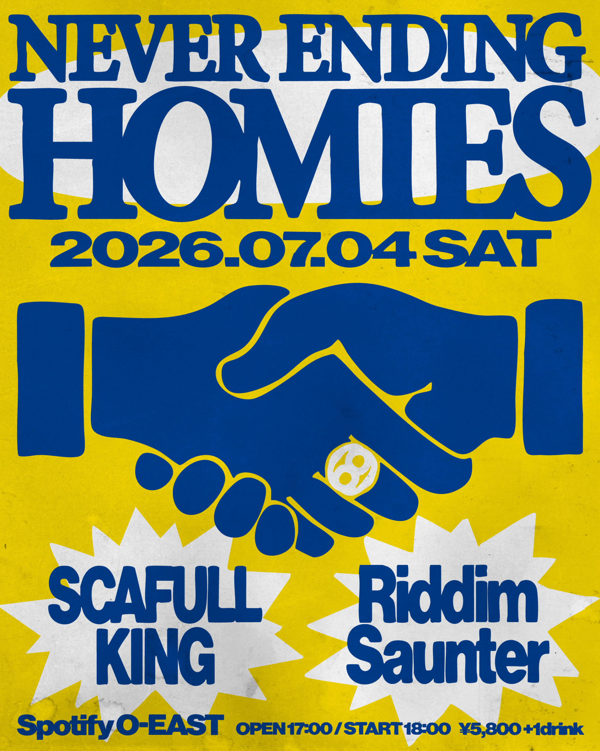 不定期に開催されてきた「Never Ending Homies」が、2026年も開催決定! 今回は、2026年もSATANIC CARNIVAL 2026 やRUMBLE×JAG 2026 など大型イベントへの出演が続々決定しているSCAFULL KINGと、昨年行われたBRAHMAN30周年イベント「尽未来祭」にて復活を果たし、2026年の1年間限定で活動を再開したRiddim Saunterの2マンライブが実現する。