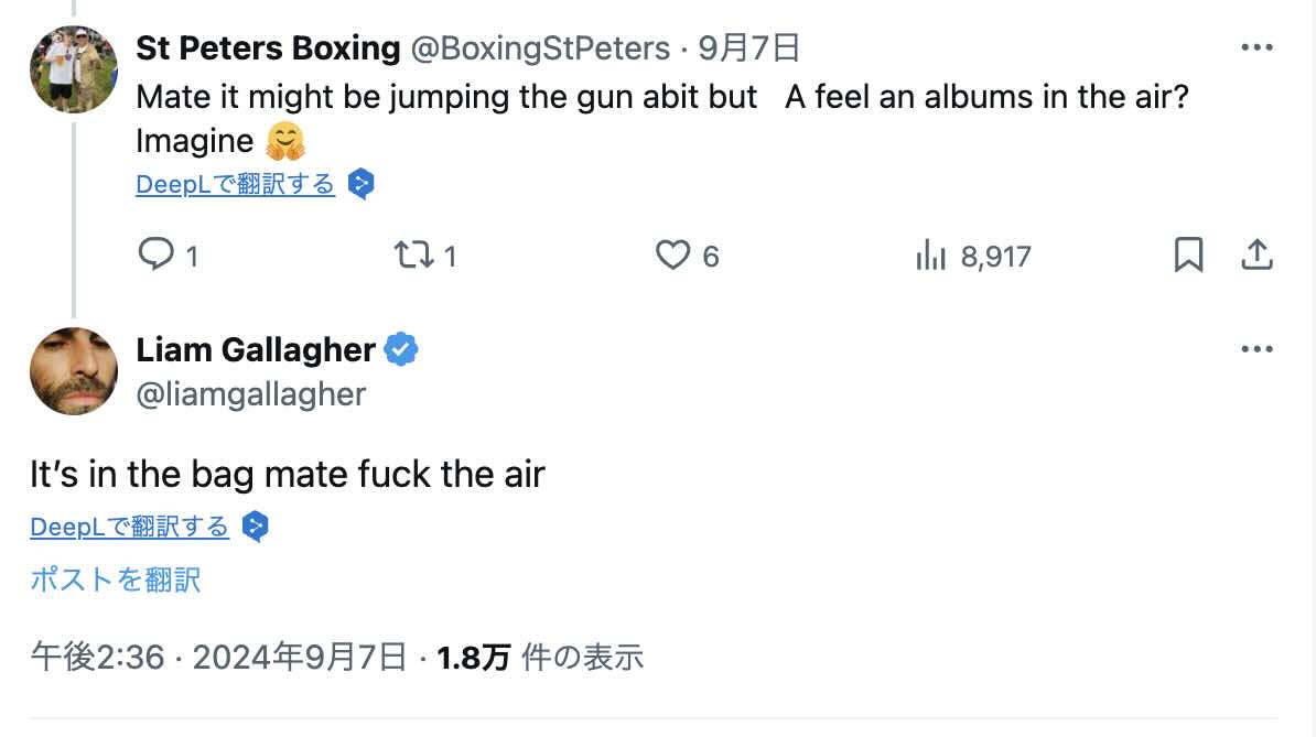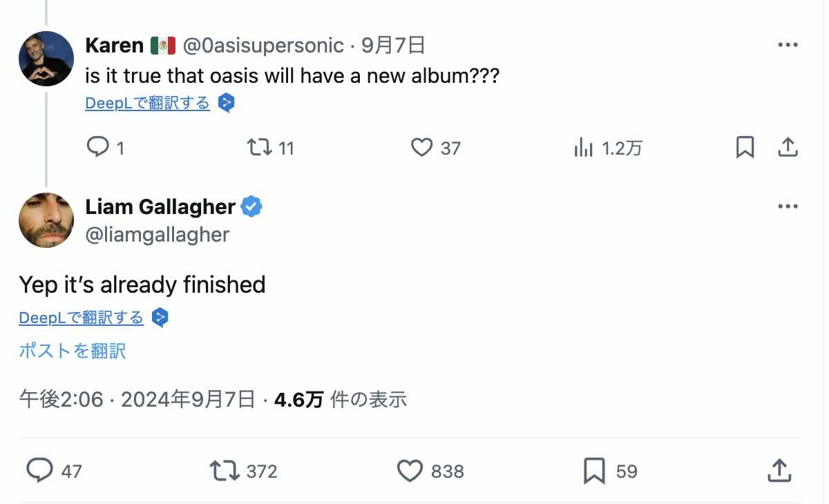 音楽メディアLOUDERなどによると、あるファンがOasisが新譜をリリースすることを期待できるかと尋ねると、「うん、もう完成しているよ」と答えた。 また、別のファンが新譜は「宙に浮いている」のかと尋ねると、リアムは「It’s in the bag mate mate f*** the air」と答えた。 今のところ、バンドは2025年の再結成ツアーの最初の日程を発表しているが、ニュー・アルバムのリリース計画はまだ正式には明らかにされていない。 期待するかしないかはあなた次第だ。