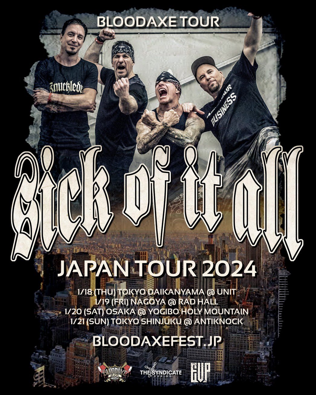 ニューヨークを拠点に活動するハードコア・レジェンド、Sick of It All のジャパンツアーが、2024年1月に行われることが発表されました。招聘はBloodaxe。現在公演日程が発表されており、10/21(土) 朝10時より先行チケットがBLOODAXE公式STOREにて販売開始となる。