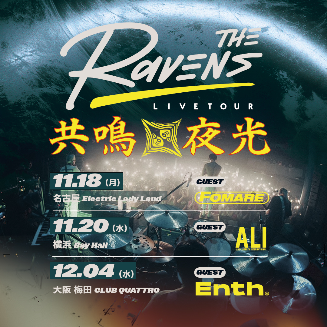 対バンツアー「The Ravens LIVE TOUR 共鳴夜光」は3公演が予定され、初日の11月18日(月)名古屋Electric Lady Land公演にFOMARE、11月20日(水)YOKOHAMA Bay Hall公演にALI、12月4日(水)梅田 CLUB QUATTRO公演にENTHがゲスト出演する。